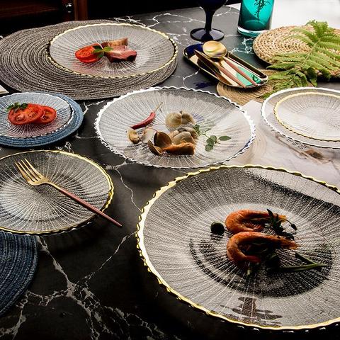 Plato de comida occidental de cristal transparente sostenible y moderno creativo, vajilla de cocina para mesa de centro, exhibición de aperitivos de frutas secas