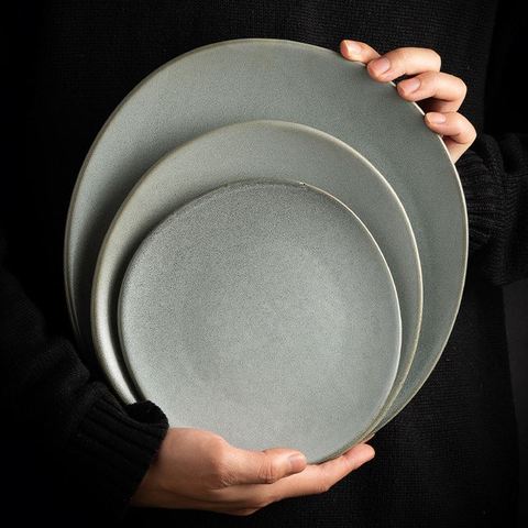 Vajilla de restaurante vintage, plato de carne de porcelana gris, ensalada, fruta, fondo plano, diseño Irregular, vajilla especial para el hogar
