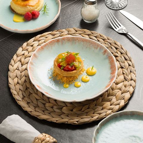 Juego de vajilla de porcelana esmaltada en horno de diseño japonés duradero, vajilla de restaurante de cerámica plana azul reactiva para pastas de bodas